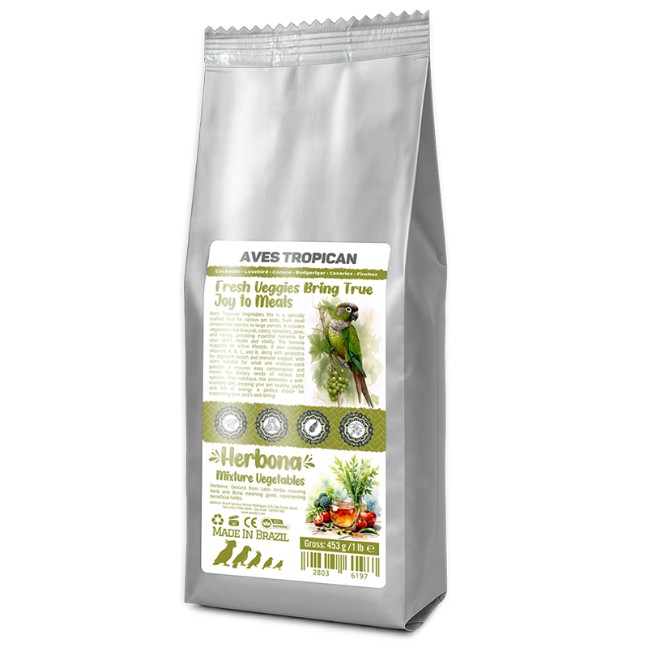 گرانول سبزیجات هربونا آوس تروپیکن یک غذای کامل و علمی برای انواع پرندگان زینتی و طوطیهای خانگی از گونههای کوچک تا جثههای بزرگ است. این ترکیب ویژه با الهام از طبیعت، شامل بروکلی تازه، ساقههای ترد کرفس، گوجهفرنگی آبدار، نخودفرنگی شیرین و شیرینی ملایم عسل طبیعی میباشد.